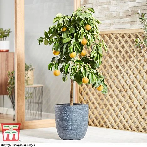 Orange trees are capable of surviving brief periods below 0C, but are best grown in large containers and moved indoors to a bright frost free position from autumn to spring. This tree is self fertile and will not need a pollination companion. Propagated onto ‘PS’ rootstock and supplied as a large specimen bush (often in fruit) in a 5 litre pot. Height: 2m (6′). Spread: 1.2m (2′).